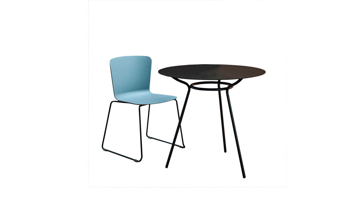 Sedia Calla impilabile con base a slitta e seduta in polipropilene, più tavolino Ola/3 in acciaio verniciato nero [Midj, cm 51x53x78h e da ø cm 62x74h]