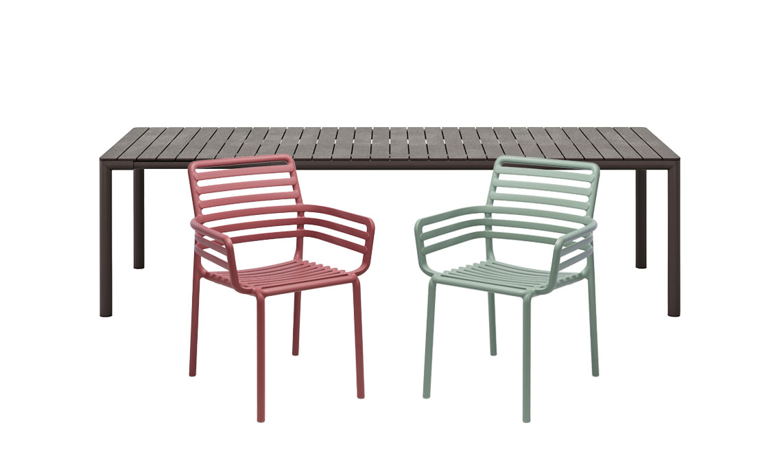 Tavolo allungabile Tevere con base in alluminio riciclabile e top dogato in plastica rigenerata 100% e 100% riciclabile, sedie Doga in resina fiberglass con braccioli. Le gambe, anche quando il top è allungato, sono negli angoli, così da sfruttare al massimo lo spazio [Nardi, cm 210/275x100x76h e cm 60x56,5x83,5h]