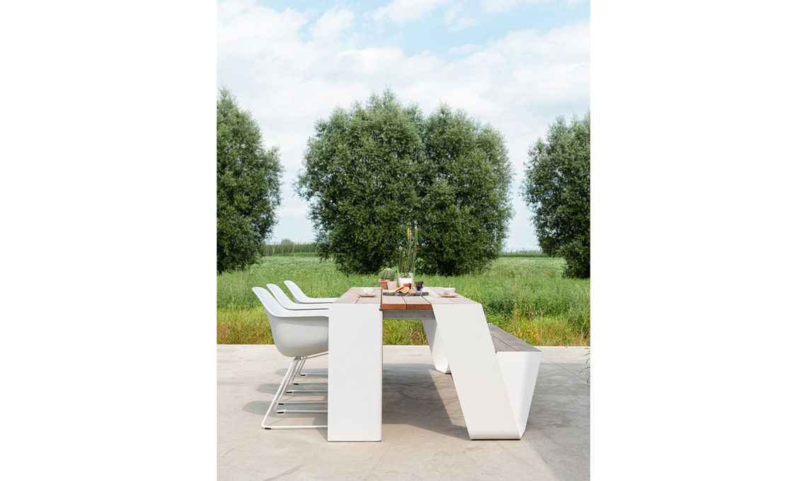Il tavolo Hopper, in acciaio e legno, dalla silhouette architettonica, rilegge con stile il tradizionale mix panca+tavolo [Extremis]