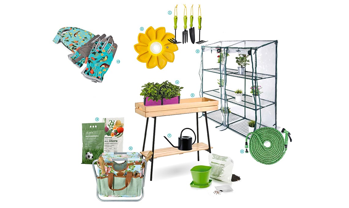Set di 4 attrezzi base per il giardinaggio [Relaxdays]. 2 Lampada solare portatile a Led [Little Sun]. 3 Serra da terrazzo a tre ripiani Big [OBI]. 4 Sacca per piante Green Block [Bloomling]. 5 Console con piano a forma di cassetta portapiante in legno Vaniljstång [Ikea]. 6 Tubo per innaffiare, completo di raccordi ed erogatore [Garden Friend]. 7 Annaffiatoio a canna lunga in metallo verniciato Canny [Casa]. 8 Seggiolino pieghevole con sacca per gli attrezzi in tela stampata e cuoio [Esschert Design]. 9 Concime con microrganismi attivi Micogreen e concime organo-minerale nutrizione completa All Crops [Il Paese Verde]. 10 In stile inglese il set cuscino per le ginocchia e guanti, Flora&Fauna [Bloomling]. 12 Set per avere sempre a portata di mano le erbe aromatiche [Tescoma].