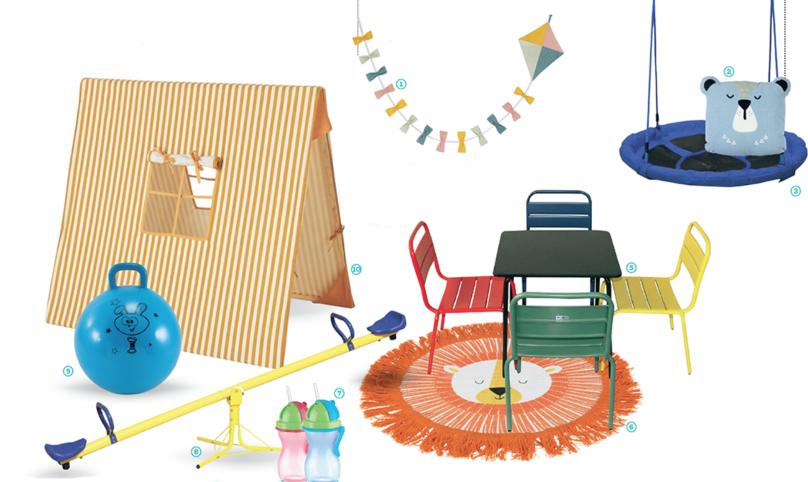 1 È in cotone organico cucita a mano la ghirlanda decorativa Kite [Westwing, cm 180 € 27,99]. 2 Tenero e morbido Matsuri, cuscino a forma di orso in cotone lavabile [Jardin d’Ulysse, cm 33x30 € 19,90]. 3 Da appendere l’altalena circolare regolabile, imbottita e in tessuto tecnico [BricoBravo, cm 100x180 € 44,96]. 4 Con disegni e suggestioni fantastiche i caleidoscopi in cartone [Moulin Roty € 9,90 l’uno]. 5 Acciaio laccato per il mini salotto da giardino Anna, con tavolo e 4 sedie in colori assortiti [Alice’s Garden € 109 il set]. 6 Lavorato a mano il tappeto a forma di leone con frange Reverie [Jardin d’Ulysse, ø cm 65 € 21,90]. 7 Con cannuccia la bottiglietta in vari colori, della linea Bambini [Tescoma € 11,90 l’una]. 8 È in acciaio e plastica il dondolo bilancina che ruota a 360° [Deghi, cm 200x 67x70h € 52]. 9 Un classico la palla per saltare con manubrio [Decathlon, ø cm 45 € 9,99]. 10 Telaio in legno e rivestimento in cotone per la tenda con finestra [Ferm Living, cm 100x100h € 119]. 11 In legno laccato e sagomato a forma di guardie londinesi il set di birilli con due palline [Cath Kidston € 35].