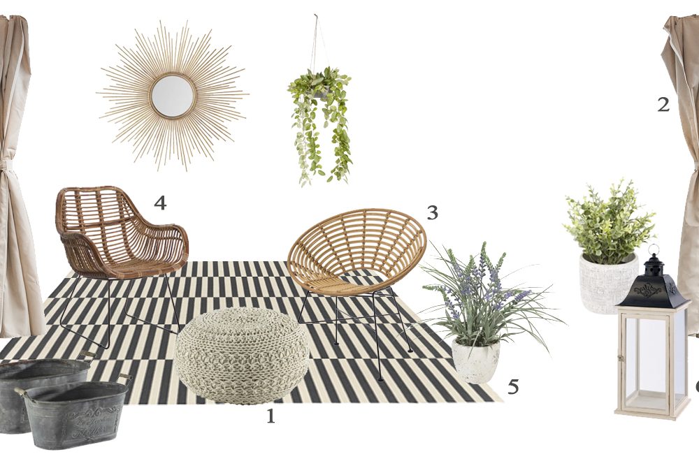 1. Cuscino Brasile fantasia, [Leroy Merlin, 120x180 cm, 129 €], 2. Tavolo da giardino e 2 sedie Calathea, [Maisons du Monde, 80x100x80 cm, 299 €], 3. The Monkey Lamp Swing Black, [Seletti, 59x49x44 cm, 330 €], 4. Set Marta da 2 vasi cilindro, [Kave Home, 45x13x13 cm e 31x11x11 cm, 45 €].