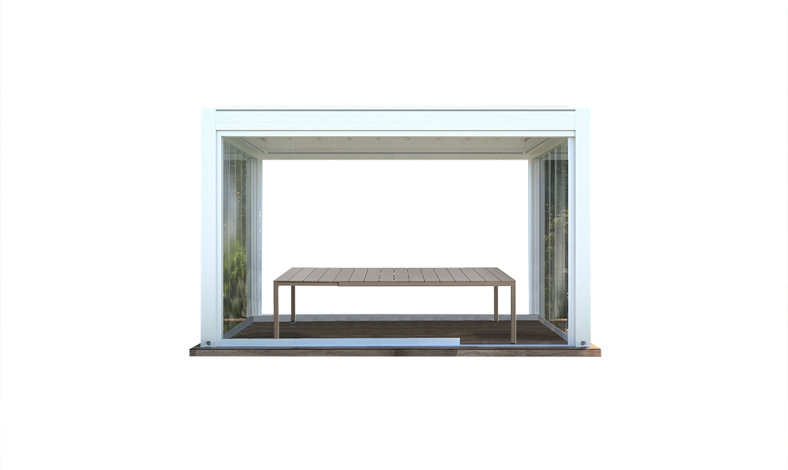 Pergola per la schermatura solare da completare, per le stagioni fredde con vetrate scorrevoli, Gennius Isola 3 [KE Outdoor Design, fino a cm 500x700, prezzo su richiesta].