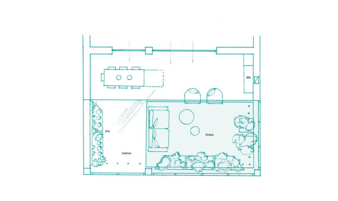 Lo spazio è stato suddiviso per ambienti: dall’area relax, fruibile tutto l’anno all’interno della pergola bioclimatica, alla zona solarium con l’orto verticale nelle vasche in Corten®. Non può mancare la zona convivialità con il tavolo raddoppiabile e il barbecue a muro.