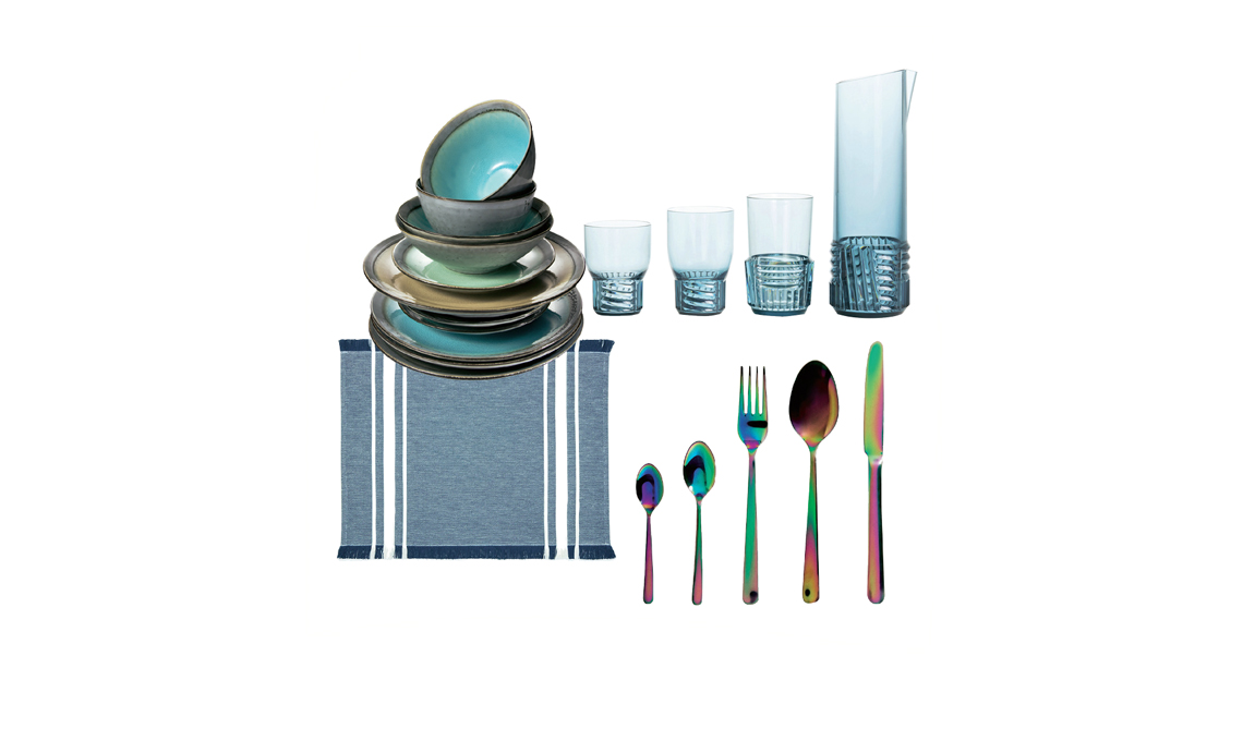 € 2,99]; piatti Emotion nella finitura smaltata effetto craquelé [Tescoma, ø cm 14/26 da € 9,90 a € 14,90]; caraffa [ø cm 10x30,5h € 59] e bicchieri [ø cm 8,5x11/13/15h da € 10 a € 15] linea Trama nel colore Blu Cielo. Di [Kartell]; posate in acciao inox a effetto cromato [Zara Home da € 1,99 a 3,99].