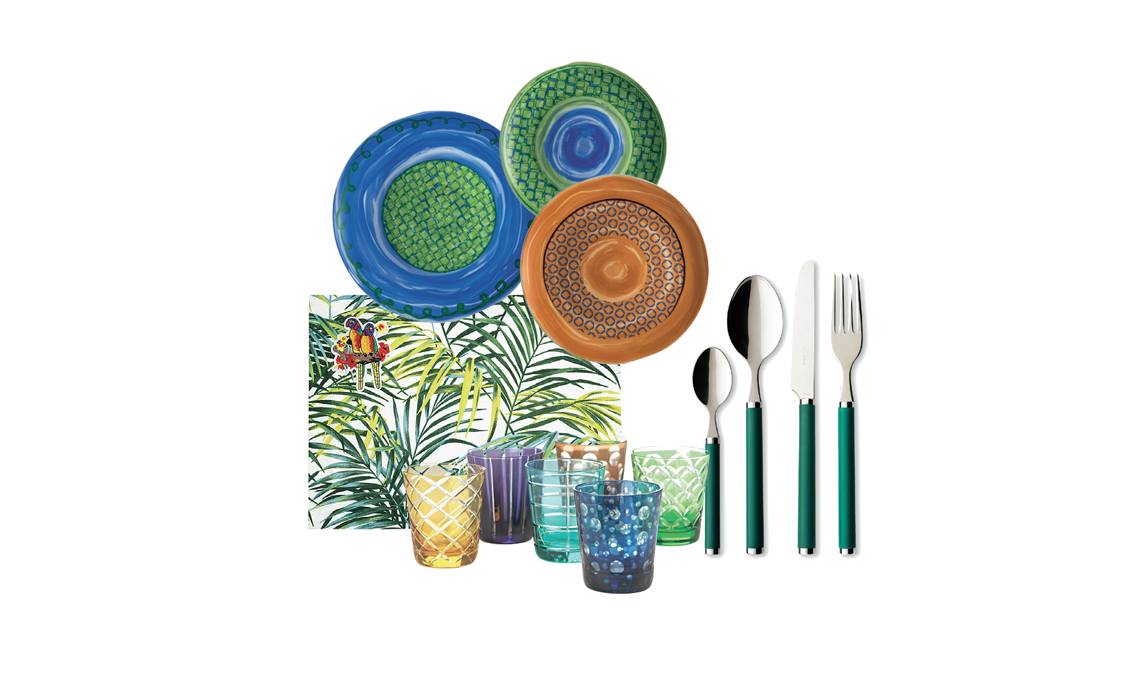 Tovaglietta in puro cotone Palm Collection con patch applicati [Milou Milano, cm 47x36 € 35 la coppia]; piatti in porcellana decorata Caos [Brandani € 69 il set da 18]; bicchieri da acqua in vetro Cuttings [Pols Potten, ø cm 8,5x10h € 93/6 pz]; posate Play! in acciaio inox con manico colorato in plastica [Villeroy & Boch € 149,90 il set da 24].