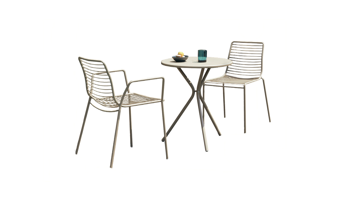 Piano in lamiera con fori décor per il tavolino in acciaio zincato Leo [ø cm 60x72h € 88], qui con le sedie impilabile Summer [cm 52x 55,5x80h e cm 57x57,5x80h € 110]. Di [Scab Design]