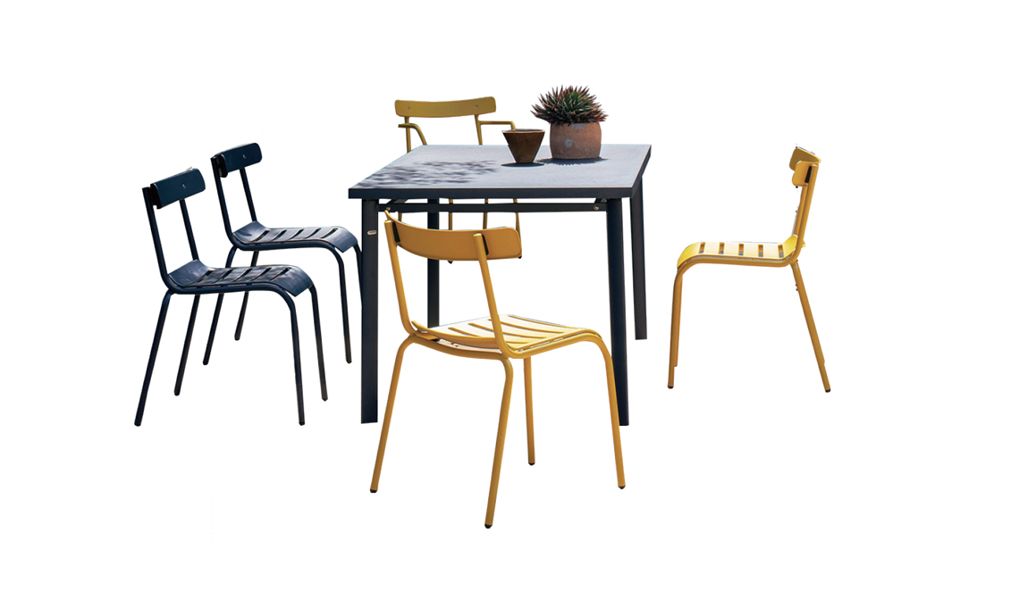 Grazie alla struttura in acciaio verniciato e lamiera zincata a caldo, il tavolo Nova [cm 80x80x74h € 258] e le sedie Miky [cm 56x55x77h € 133/pz] resistono ad agenti atmosferici e usura. Di [Emu].