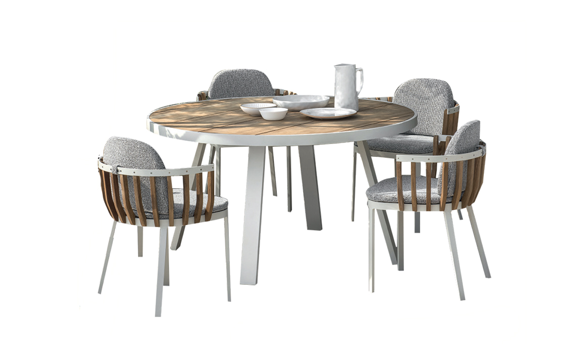 il raffinato tavolo rotondo [ø cm 140x74h € 1.600] e le poltroncine super comfort Swing [cm 60x53x81h da € 550]. Di [Ethimo].