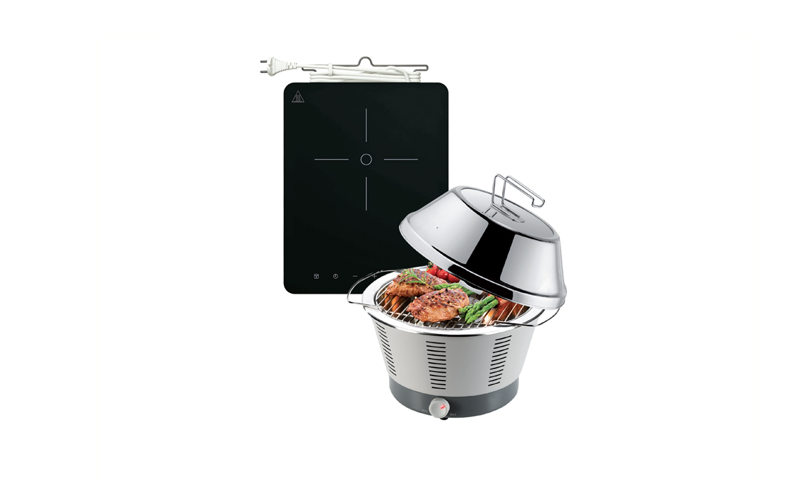 Piano cottura a induzione Tillreda con comandi a sfioro [Ikea, cm 30x38,5x5,4h € 49] e BBQ [ø cm 40x21h € 149,90] di [Tescoma] come il coperchio Party Time [cm ø 30,5x15h € 29,90].