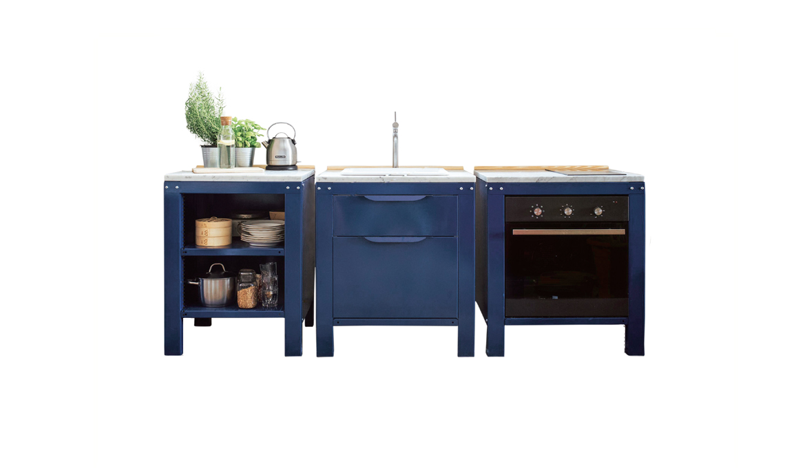 Va tenuta al riparo sotto una copertura la cucina a 3 moduli con elettrodomestici da esterno