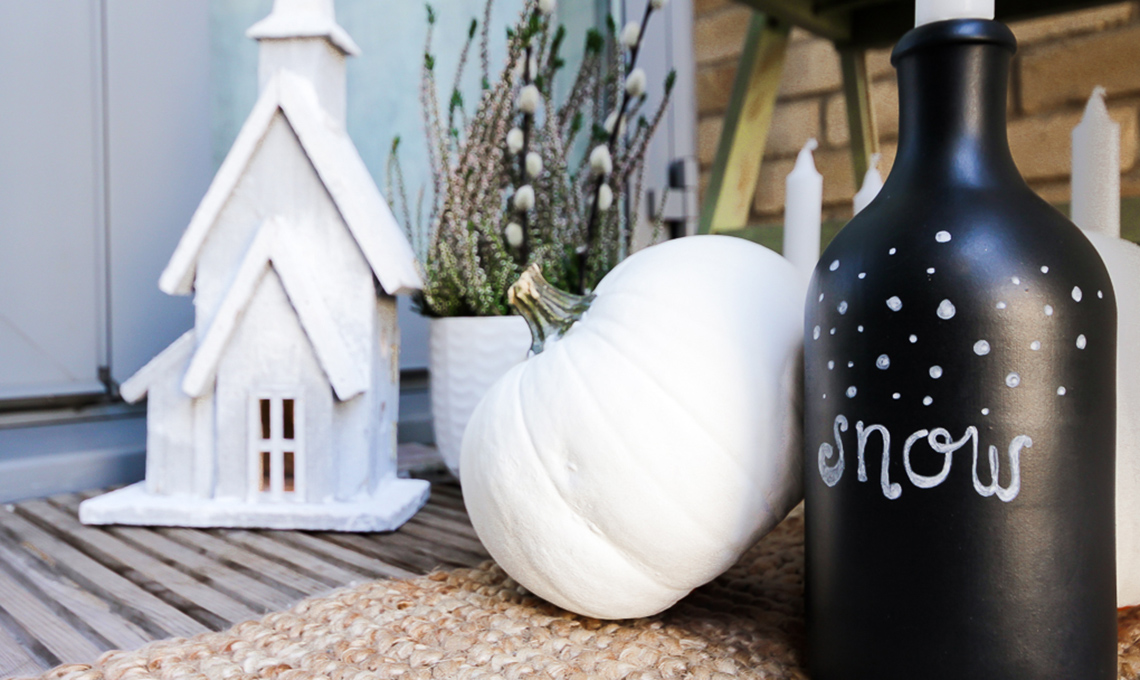 Ho riciclato le zucche di Halloween dipingendole di bianco. E ho messo una scritta con qualche fiocco di neve su una bottiglia nera che uso come porta candele. Il tappeto di corda l’ho trovato su un sito di vendita di oggetti usati a pochi pound, così non ci resto male se si dovesse macchiare o bagnare con l’umidità. Per finire, una grande stella di carta che ondeggia al vento.
