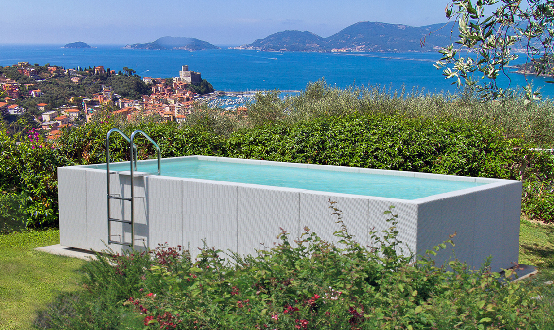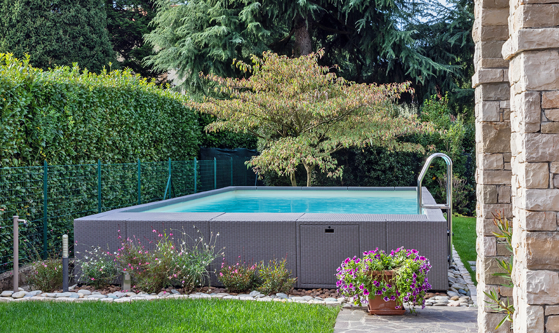 Seminterrata autoportante. Interrata per soli 55 cm, Dolcevita Divina è rivestita in fibra sintetica intrecciata su telaio in alluminio. Qui è nella versione da montare su terra con basamento in acciaio [Piscine Laghetto,