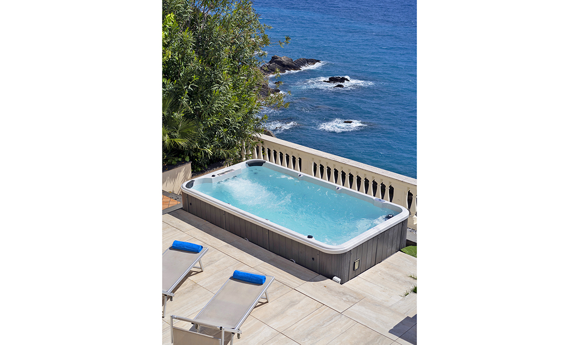 Swim-spa fuoriterra. Rigida e amovibile, Riccione ha 6 turbo-jet per praticare nuoto controcorrente e 3 zone Spa con 20 getti ad acqua e poggiatesta dove rigenerarsi. La cascata, le 4 fontane, la musica, l’aromaterapia e la cromoterapia trasformano i bagni in esperienze emozionali [Dimhora, cm 412x220x 112h € 10.900 + iva].