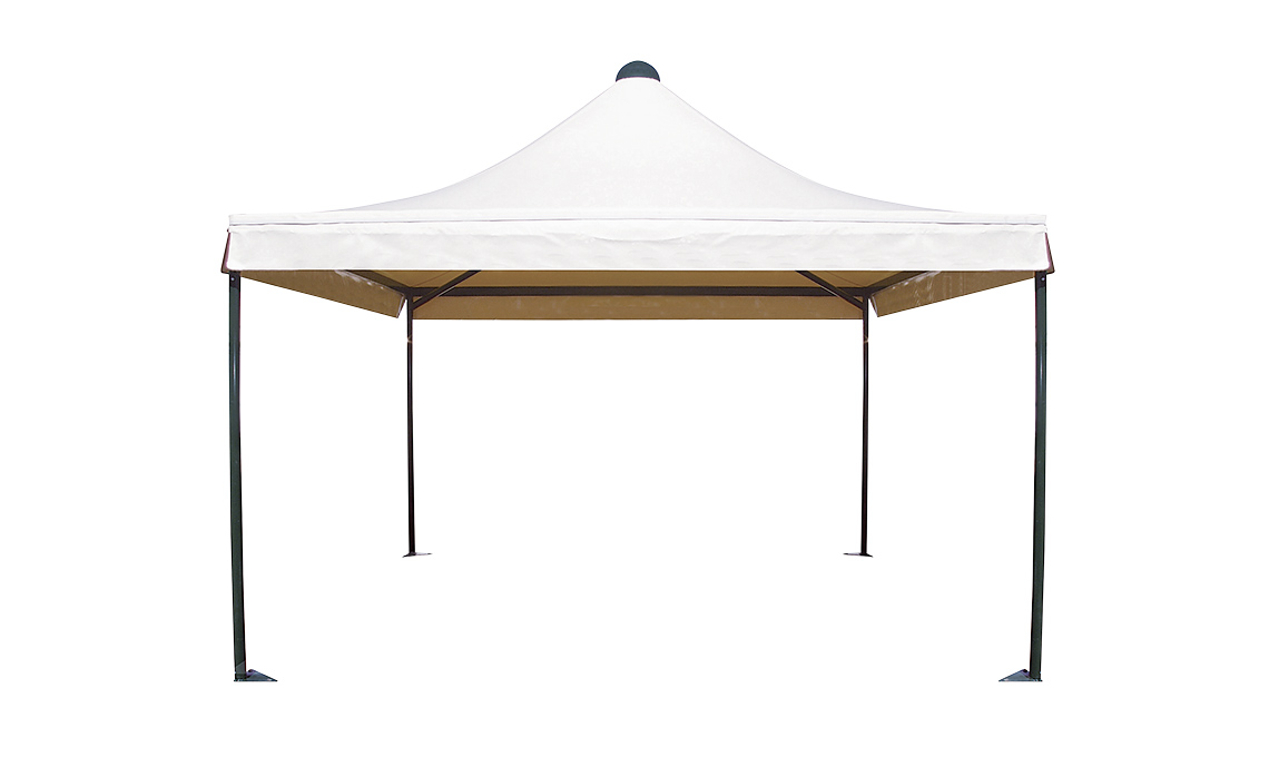 Per ripararsi dal sole: Gazebo R501 con struttura in acciaio laccato e telo in pvc. Può essere completato con pareti scorrevoli di BT Group. Si monta in pochi minuti la vela parasole idrorepellente di Geertop.