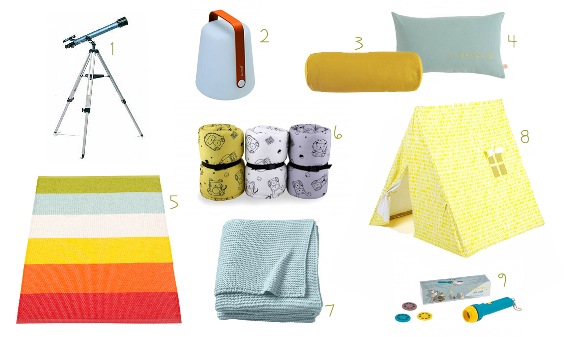 Cosa c'è di più bello ed emozionante di guardare le stelle? Perché non creare un angolo con tenda da campeggio e tanti complementi per divertirsi? Ecco cosa ti servirà per creare l'angolo per le sere al chiaro di luna. [1] Telescopio skywatcher 60/700 (129€), [2] Lampada a LED senza fili di Fermob (77€), [3] Cuscino Sinbad giallo di Nobodinoz (46€), [4] Cuscino verde acqua di La cerise sur le gâteau (36€), [5] Tappeto in plastica Molly di Popellina (78€), [6] Sacco nanna di Mezoome (100€), [7] Coperta Ingabritta di IKEA (24,99€), [8] tenda gioco campeggio di Deuz (130€) e [9] C'era una volta di Moulin Roty (12,90€).