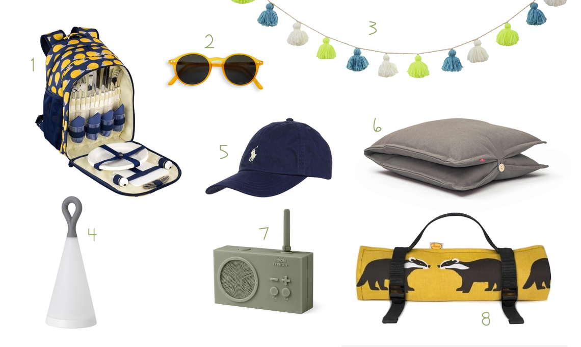 Un giardino e qualche albero ed è subito picnic. Un attività amata dai grandi e ancora di più dai bimbi. Cosa ci serve? Tanti complementi divertenti ma ricordati anche occhiali da sole e cappellino. [1] Zaino picnic di Anorak (85€), [2] Occhiali da sole di Izipizi (29€), [3] Ghirlanda di Meri Meri (19€), [4] Lampada a LED Solvinder di IKEA (14,99), [5] Cappello blu con visiera di Polo Ralph Lauren (29€), [6]Cuscino pouf Clip di Nidi (316€), [7] Radio waterproof di Marc Berthier (60€) e [8] Coperta impermeabile di Anorak (50€).