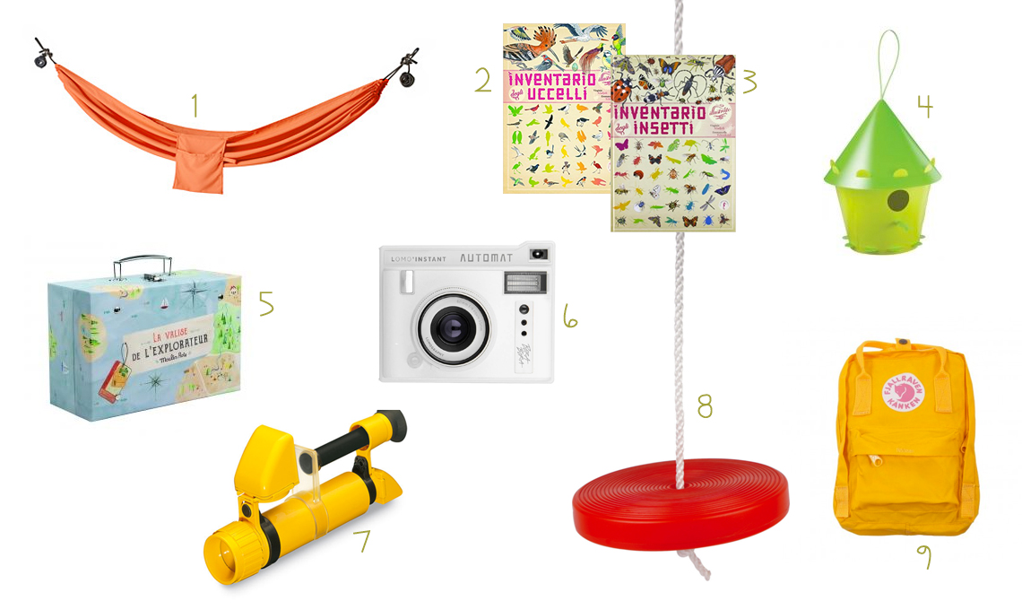 Per i bimbi che amano l'avventura non possono mancare valigetta dell'esploratore, libri, giochi avventurosi, macchine fotografiche e strumenti per studiare. Cosa abbiamo scelto? [1] Amaca Risö di Ikea (24,99€), [2] Inventario illustrato degli uccelli di Emmanuelle Tchoukriel e Virginie Aladjidi (12,75€), [3] Inventario illustrato degli insetti di Emmanuelle Tchoukriel e Virginie Aladjidi (12,75€), [4] Casetta per gli uccelli di Tweet tweet home (14€), [5] Valigetta dell'esploratore di Moulin Roty (49€), [6] Macchina fotografica Automat Instat di Lomography (151€), [7] Triscope Threek di Navir (19,90€), [8] Altalena rossa in plastica da esterno di Small Foot (14€) e [9] Zaino Kånken Mini giallo di Fjällräven (79,95€).