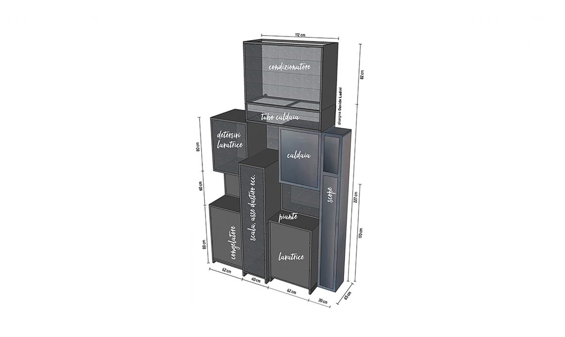 Vi presentiamo il progetto di un mobile da balcone disegnato su misura e multitasking. Ospita condizionatore, lavatrice, freezer, caldaia, ripostiglio, piante, ecc. Si trova in una casa di 60 mq che ha la fortuna di avere un ampio balcone. È lì che sono finiti, appesi alla parete, caldaia e condizionatore. Sotto, restava spazio: perché non metterci il congelatore e la lavatrice? Detto, fatto. Serviva, però, un’idea per rendere estetica, oltre che funzionale, questa zona di servizio. La stylist Giovanna Fra ha progettato ad hoc un mobile multitasking che svolge ben 9 funzioni, ingloba uno sgabuzzino e vani a giorno per piccole piante. Formato da blocchi a varie profondità, ha una linea originale, e la lamiera forata di alcune ante non solo permette l’aerazione interna, ma si trasforma in texture decorativa. Geniale!