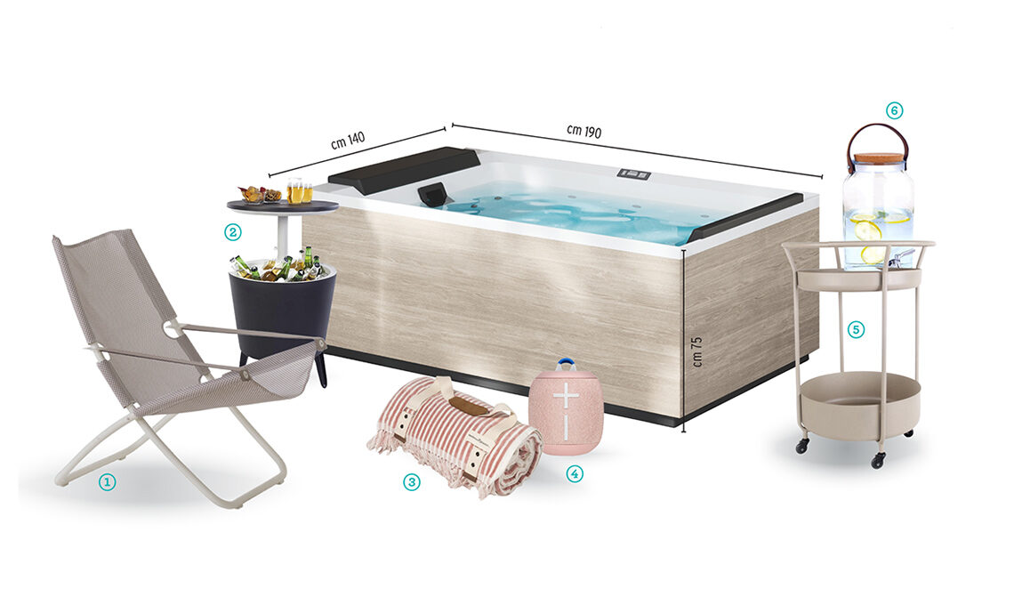 & Pleasure, cm 168x168 € 84,95]. 4 speaker Bluetooth® Wonderboom 2 [Ultimate Ears € 99,99]. 5 carrello Corona [XL Boom, ø cm 61x84h € 425]. 6 dispenser bevande [Navaris ø cm 24x36h € 34,99]. Mini piscina Divina M, con idromassaggio, sistema a luci led Cromolight, controllo remoto in Wi-Fi e diffusori di musica Bluetooth® [Novellini, cm 190x140x75h € 15.860].