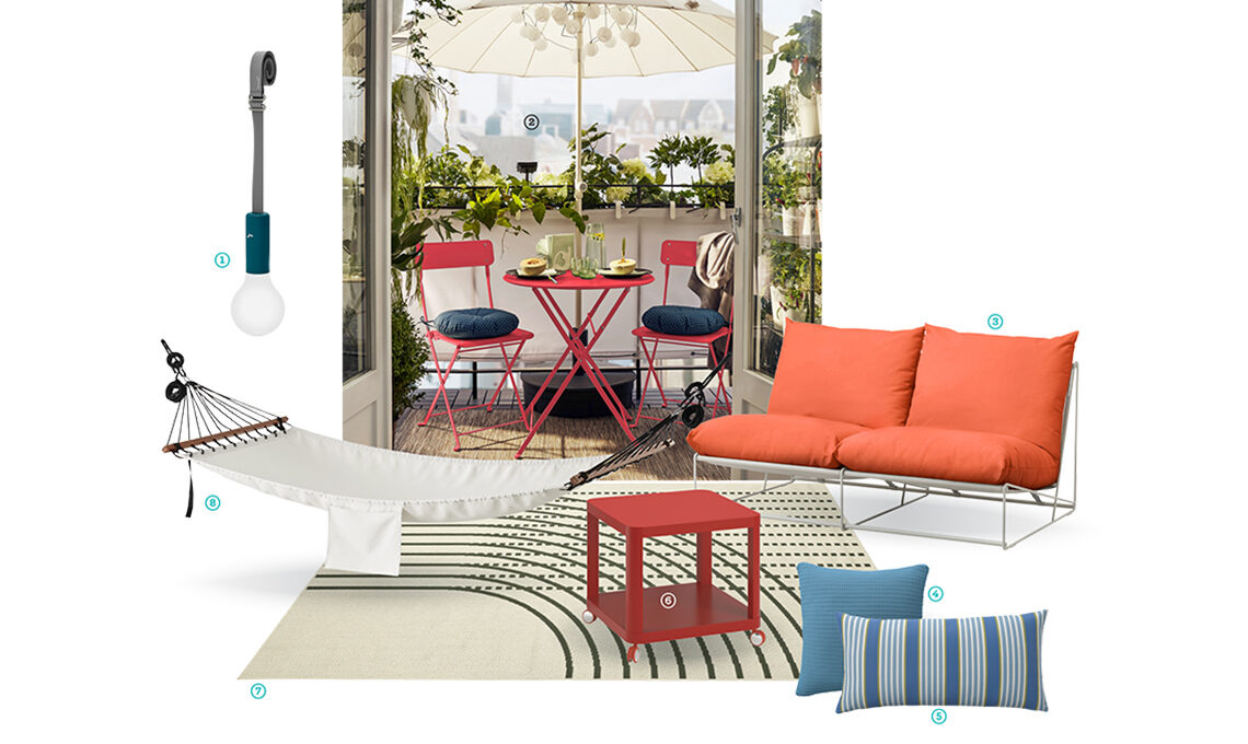€ 15]. 5 cuscino Funkon con fodera in poliestere [Ikea, cm 30x58 € 8]. 6 tavolino rosso con rotelle Tingby [Ikea, cm 50x50x45h € 30]. 7 tappeto per esterni Tömmerby [Ikea, cm 160x230 € 59,95]. 8 amaca Fredön con telo in poliestere e stecche in legno massiccio [Ikea, cm 200x100 € 50].