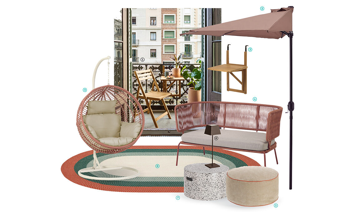 1 sedia pieghevole Daliana in legno massello di acacia FSC, ossia sostenibile [Kave Home, cm 44x47x78h € 49 cad]. 2 ombrellone Giardino Parasol con telo e base semicircolare [Casa.Pro, cm 300x150x230h € 71,99]. 3 tavolino a ribalta in legno massello di acacia certificato FSC [Kave Home, cm 42x34x68h € 49]. 4 divano a 2 posti Nadin in acciaio zincato e corda intrecciata, nella finitura terracotta [Kave Home, ø cm 27x25h € 229,36]. 5 pouf Dalila in PET riciclato [Kave Home, ø cm 60x30h € 77]. 6 lampada portatile a Led Siesta Corten [Rossini Illuminazione, cm 10,5x10,5x37h € 150,70]. 7 tavolino Jenell in terrazzo veneziano [Kave Home, ø cm 52x30h € 99]. 8 tappeto Dalila in plastica riciclata da bottiglie recuperate nei mari [Kave Home, cm 160x230 € 199]. 9 poltrona sospesa Elianis, con base in acciaio e seduta in corda intrecciata color terracotta, resistente ai raggi UV [Kave Home, cm 107x105x197h € 625].