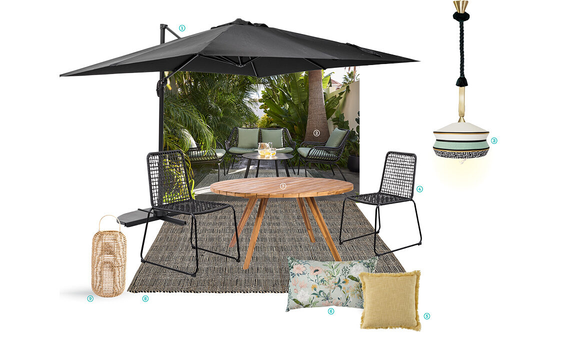 1 ombrellone a sospensione Riva con palo decentrato [Casa, cm 300x240x250h € 199 esclusa la base]. 2 salotto Set Lounge Charles in acciaio e wicker sintetico, più cuscini in filato di poliestere. È composto dal divano a 2 posti [cm 119x67x75h] e da 2 poltrone [cm 60x67x75h]. Di [Casa € 599] come il tavolino Nurio in acciaio e zinco [ø cm 60x46h € 39,95]. 3 lampada a sospensione Calypso Outdoor Antigua, in corda e tessuto impermeabili [Contardi, ø cm 36x271,5h prezzo su richiesta]. 4 sedie nere Aleks, impilabili [Casa, cm 57x61x84h € 49,95 cad]. 5 cuscino Monica in cotone e poliestere [Casa, cm 45x45 € 14,95]. 6 cuscino multicolore in poliestere Brooke [Casa, cm 50x30 € 7,95]. 7 tavolo in legno di acacia Arthur, per ospitare 6-8 persone [Casa, ø cm 150x78h € 499]. 8 tappeto nero in fibra naturale Ethnic [Casa, cm 230x160 € 99]. 9 lanterna Alabama Coco, in fibra di cocco [Casa, ø cm 30x54h € 69].