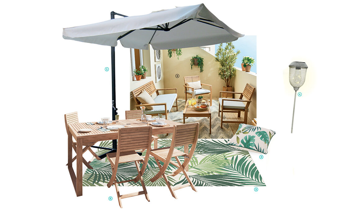 1 ombrellone decentrato con telo in poliestere nel colore écru e palo laterale, per lasciare più spazio e libertà di movimento [Leroy Merlin, cm 300x200 260h € 149,90]. 2 coffee set Naterial Solis in legno massello di acacia FSC, composto da divano a 2 posti [cm 122x61x81h], 2 poltrone [cm 62x61x81h] e tavolino basso [cm 73,2x50x40h]. Di [Leroy Merlin € 279]. 3 cuscino multicolore Marjorie, in fibra di poliestere [Leroy Merlin, cm 40x40 € 10,99]. 4 lampada solare a Led Taupe Solar Mesh Stake in rete metallica e con picchetto [Ella James, ø cm 11x81h da € 21/pz]. 5 tappeto per esterni Star realizzato in polipropilene, facile da pulire con una spugna umida e molto resistente allo sporco [Leroy Merlin, cm 160x230 € 79,90]. 6 set da pranzo in legno di acacia Naterial Solis, composto da tavolo allungabile fino a 2 metri [cm 90x150/200x75h] e 4 sedie impilabili [cm 38x51x81h]. Di [Leroy Merlin € 297].