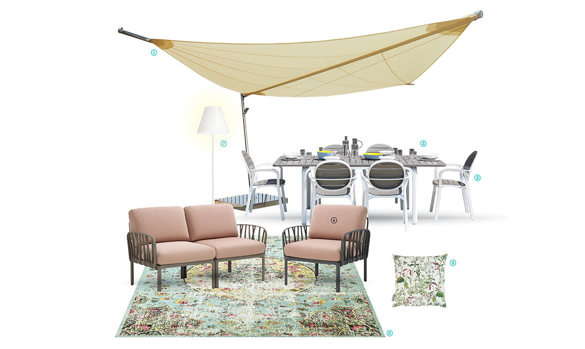 1 tenda ombreggiante a vela KE Kolibrie, orientabile a 360°, con palo di sostegno in acciaio inox e tessuto Dacron® Bianco resistente alle intemperie e ai raggi UV [KE, cm 320x320x356h da € 6.974]. 2 tavolo allungabile Alloro 140 Extensible, con piano dogato in DurelTop, un materiale completamente riciclabile. Le gambe sono in alluminio verniciato a polveri [Nardi Outdoor, cm 100x140/210x75h da € 1.159]. 3 sedie impilabili con braccioli Palma, leggere ma molto stabili [Nardi Outdoor, cm 59x56,5x86h € 83,57/pz]. 4 poltrona [cm 79x78x88h da € 486,78] e divanetto componibile [cm 144x78x88h da € 875,96] entrambi della linea Komodo in resina fiberglass. Di [Nardi Outdoor]. 5 cuscino impermeabile Welsh Meadow Cream [Celina Digby, cm 43x43 da € 32,20]. 6 tappeto da esterno Oriente Pastello [Paco Home, cm 200x280 € 94,99]. 7 lampada da terra Itaca, con diffusore in materiale plastico color opale [Ideal Lux, ø cm 38x169,5h € 290].