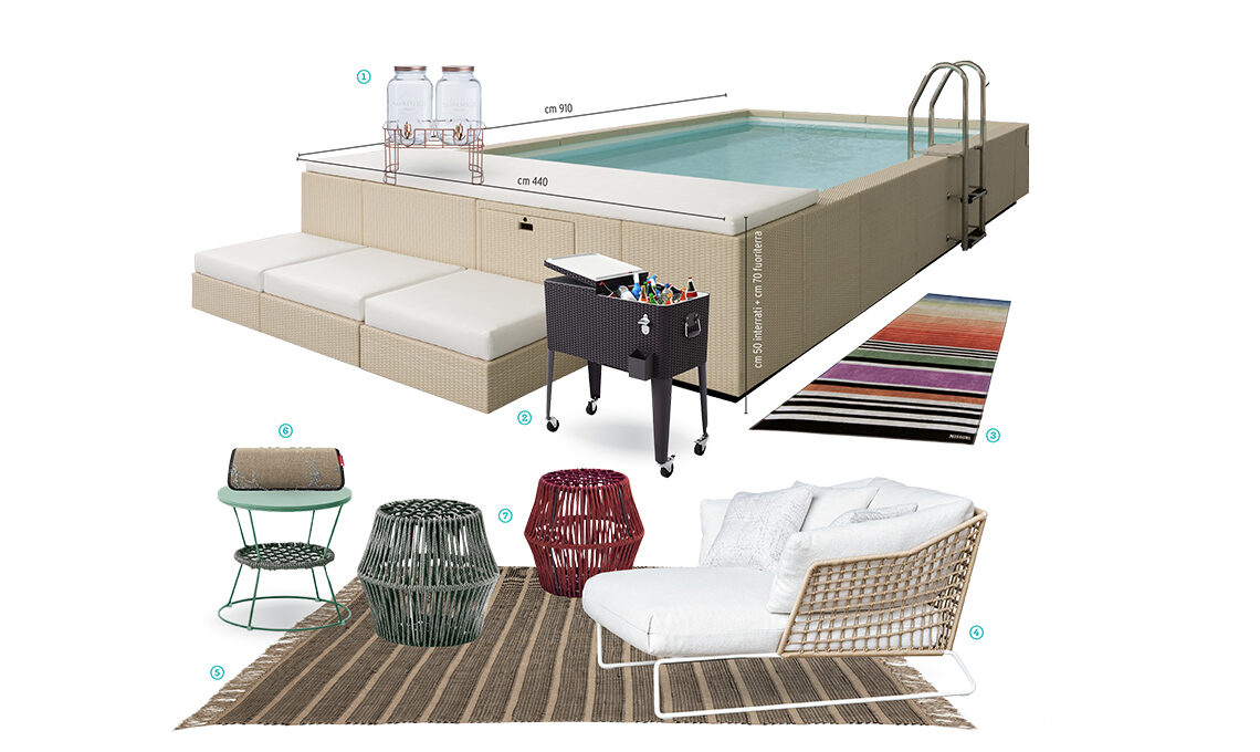 da € 58,40]. 7 tavolini e pouf bassi Ziggy, dalle silhouettes a botte e a clessidra [Saba Italia, cm 32/44x40h da € 689,30]. piscina seminterrata Divina,rivestitaconelegantipannelliinrattansintetico intrecciato a mano su telaio di alluminio. È dotata di un’area prendisole a bordo vasca, attrezzata con lettino [Piscine Laghetto, cm 910x440x120h da € 22.618 + Iva, trasporto e montaggio].