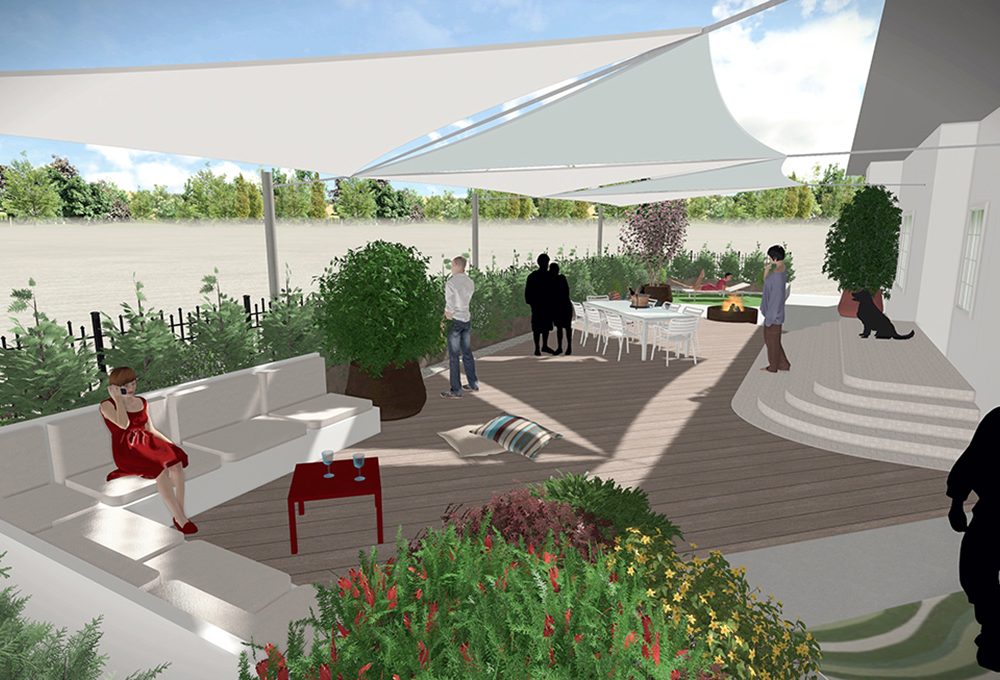 - Tre piccole aiuole di forma triangolare vivacizzano le geometrie del giardino aumentando la percezione di ampiezza e colorandone il manto con fioriture cicliche stagionali tra cui Echinacea alba, Salvia nemorosa, Aster, Allium ramosum ed Euphorbia characias.