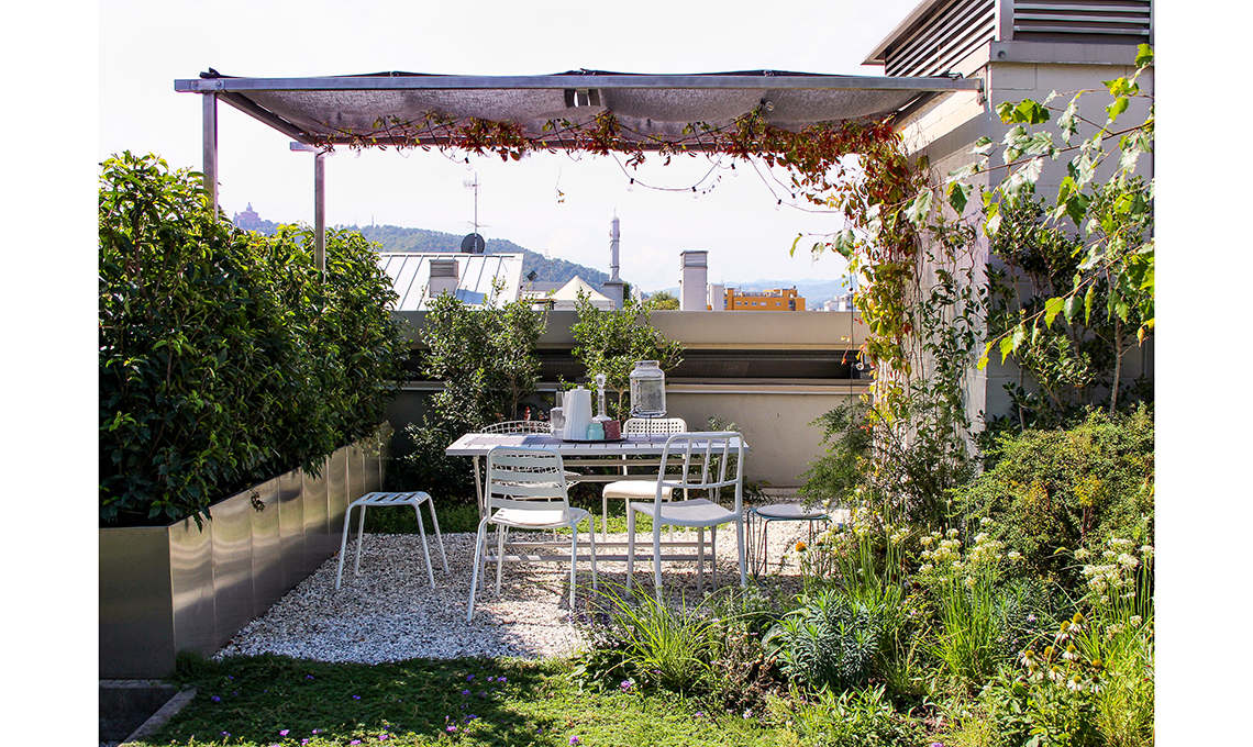 - Il tono industrial torna anche nell’acciaio inox scelto per realizzare artigianalmente le fioriere che contengono le siepi di confine (Prunus lusitanica) e il gazebo addossato alla canna fumaria, ingentilito con robusti rampicanti (vite americana, gelsomino) in seguito sormontato da un tessuto nautico leggermente traspirante per evitare spiacevoli spanciamenti a seguito delle piogge.