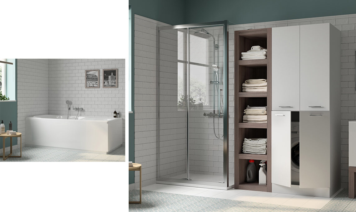 Il servizio BagnoFacile che sostituisce la vasca con una doccia lasciando spazio alla colonna lavanderia: il pacchetto comprende prodotti e rivestimenti doccia, materiali per la posa, consegna e smaltimento [Leroy Merlin da €1.749].