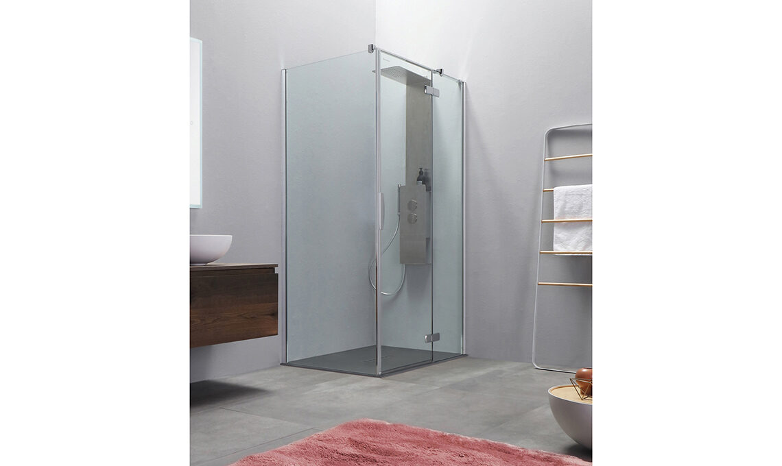 Piatto antiscivolo Ardesia Plus Matt e box GL8 con vetro temprato da 8 mm dotato di pellicola Safety&Clean che, in caso di rottura, ne trattiene i pezzi [Kinedo, cm 70x100 €1.440].