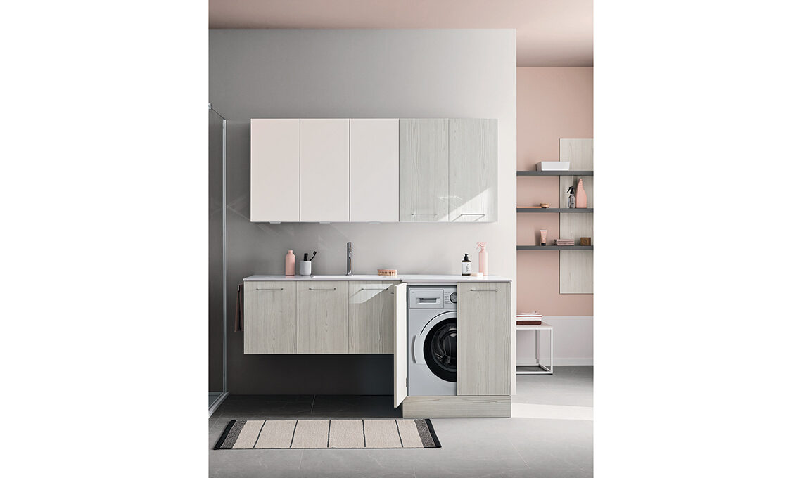 Bolle 3 finitura Abete Cairo con basi portalavabo e portalavatrice top in mineralguss, lavabo integrato Ari e pensili [Arbi, cm 175,6x50,5/68x87,4h + pensili cm 73,4h €3.585].