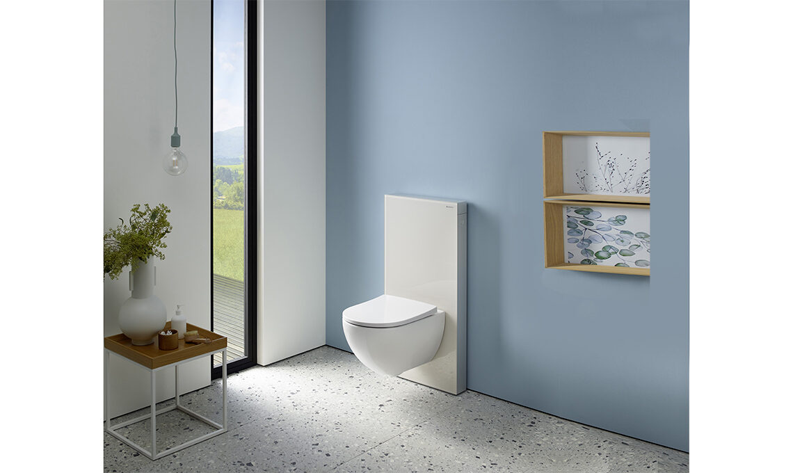 Geberit Monolith Plus per vaso sospeso con rivestimento frontale in vetro grigio sabbia, con risciacquo a 2 portate, luce e aspirazione cattivi odori [Geberit, cm 48x10x101h €2.578].