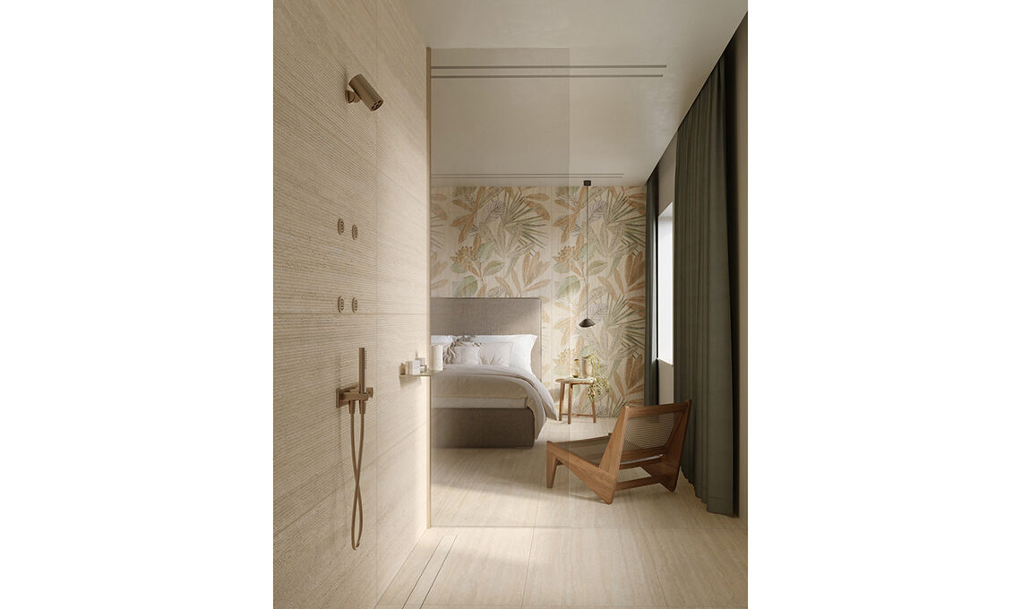 Grès Mystone Travertino Classico Strutturato RT R11 con stampa digitale Sublime Sync e tecnologia StepWise che lo rende morbido al tatto ma antiscivolo [Marazzi, cm 60x120 €67/mq].
