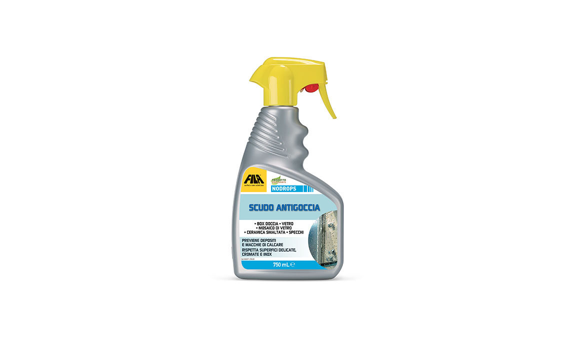 Spray NoDrops biodegradabile antigoccia da spruzzare sui vetri del box doccia: l’acqua scivola via senza lasciare tracce di calcare [FILA Solutions, l 0,75 €10].