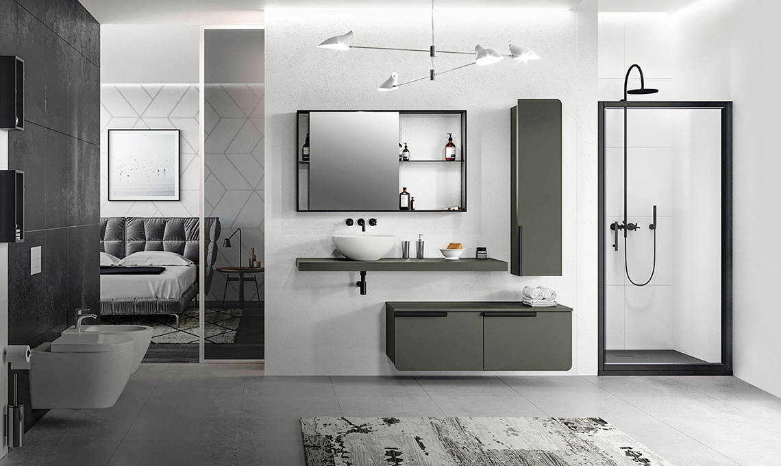 La comp. C601 Rond in laccato fucile opaco prevede mensola per lavabo, base e colonna pensili e scaffale con specchio [Iotti €3.769]. box doccia Zephyros in vetro temperato con profilo in alluminio Nero Matt [Novellini, da cm 70x195h da €491].