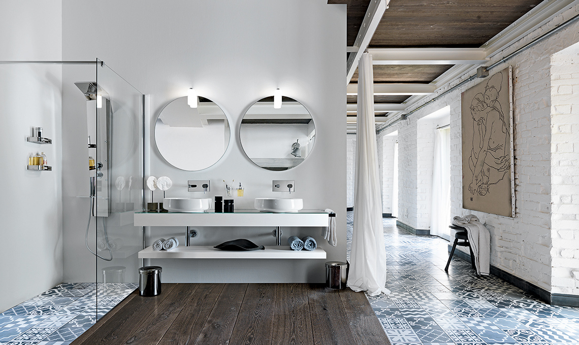 Qamar: lavabi in ceramica lucida [ø cm 48 da €540,46], appoggiati su una mensola in laccato opaco Bianco dal top in vetro-specchio. La doccia Walk In ha pannello in cristallo spessore 8 mm [cm 120x200h da €685,68]. Tutto [Inda].