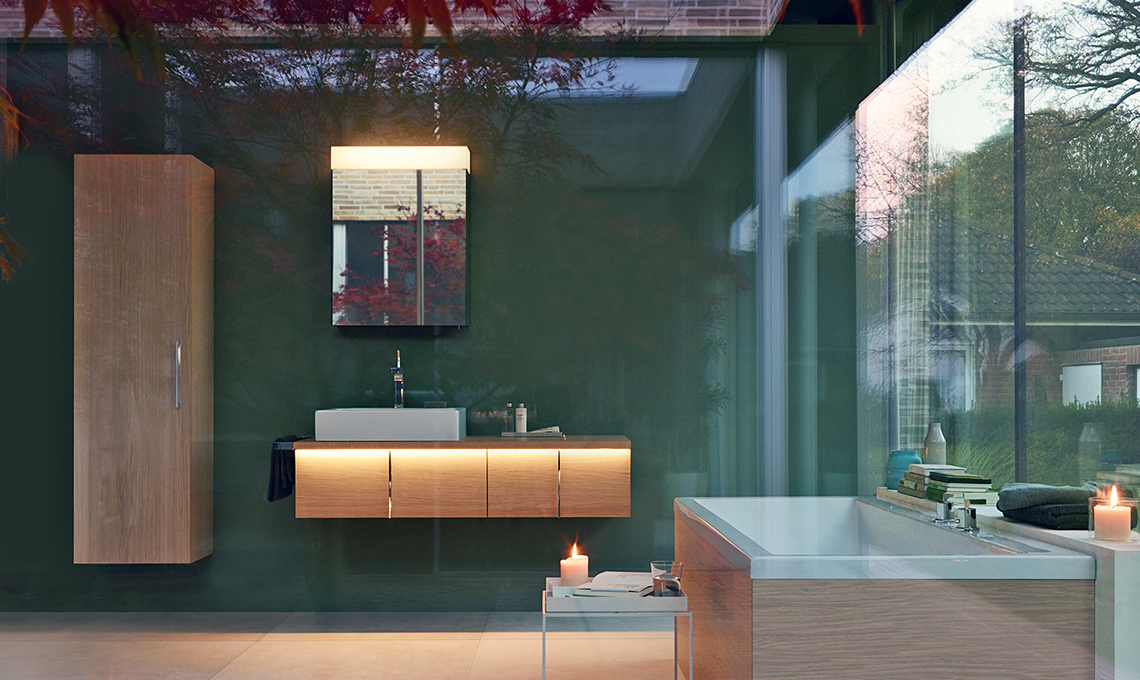 Ispirazione jap: sono in impiallacciato finitura rovere gli elementi della collezione Vero, che scaldano l’atmosfera con un tocco light. Pensile a colonna [cm 50x36x176h €1.500], mobile con lavabo [cm 140x55 €3.295], vasca da incasso [cm 170x75 €898]. Di [Duravit].