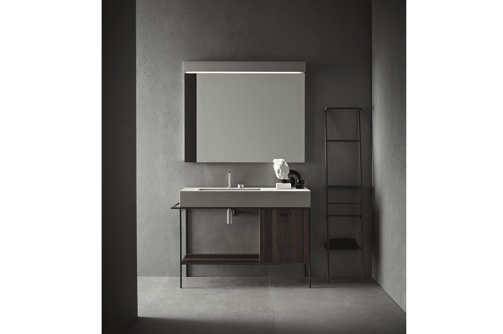 Craft ha il lavabo integrato nel top in cemento, fissato sulla base in metallo grigio con contenitore con anta e ripiano in rovere termocotto dogato. Completo di specchio con luce [Novello, cm 120x45x80h €4.293].