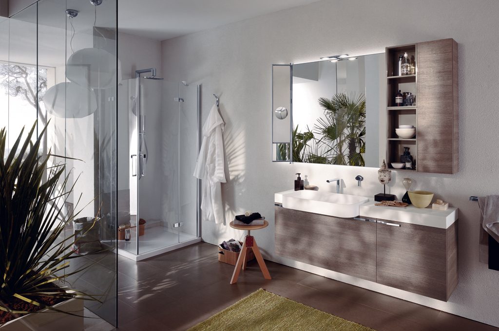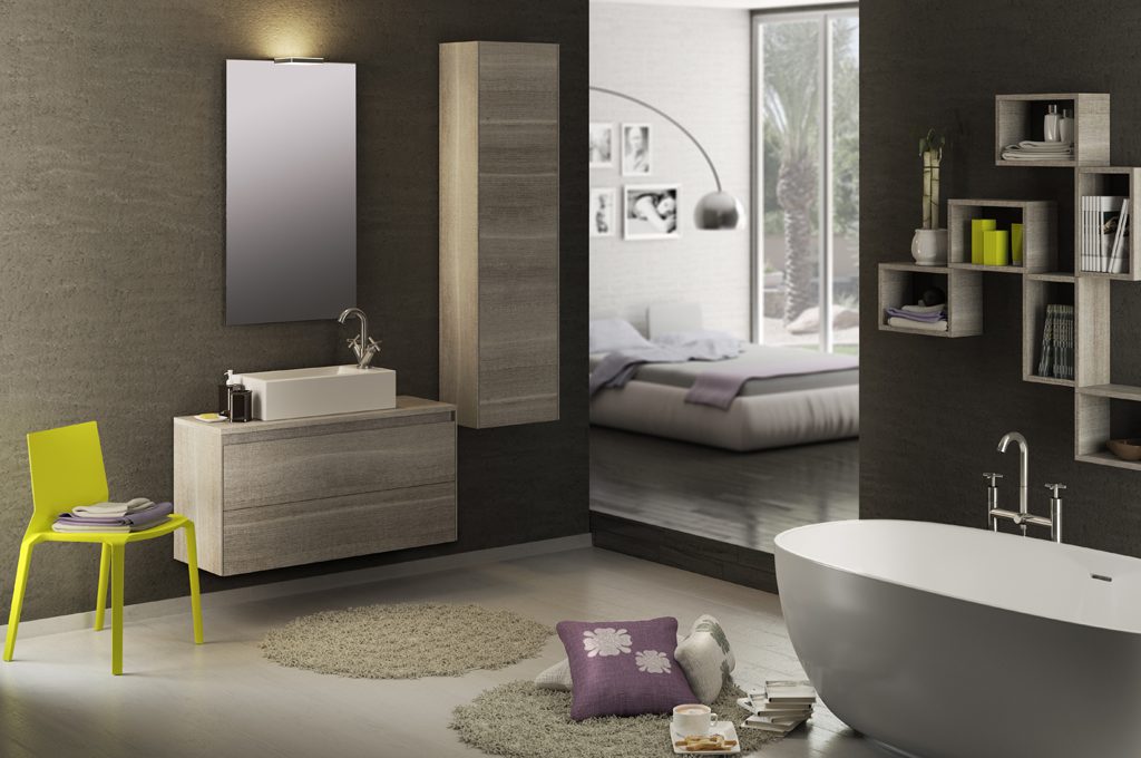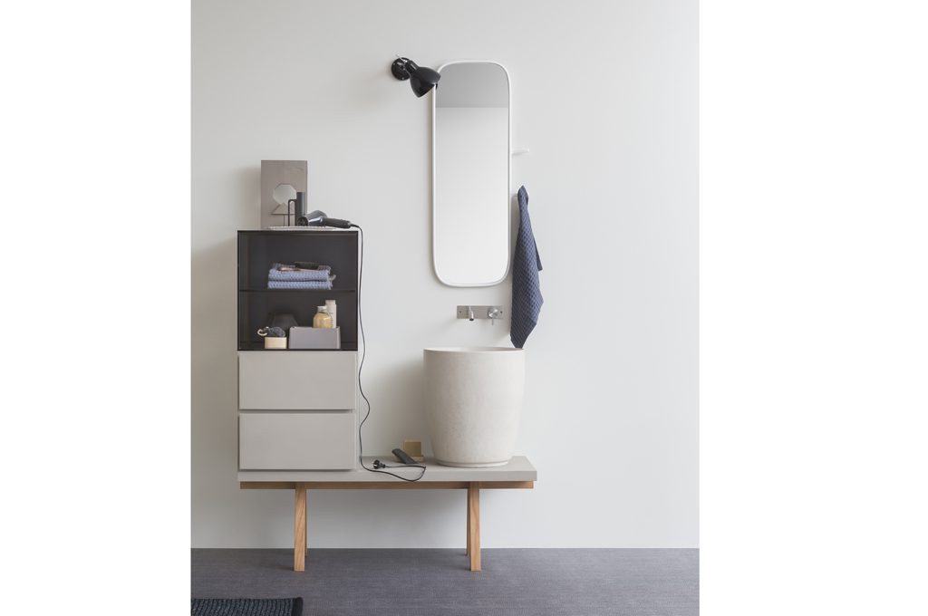 Esperanto, qui ha la base in legno e top in ecomalta più lavabo a catino in cocciopesto, un modulo a cassetti, uno a giorno in vetro più specchio lungo minimal [Rexa Design, cm 120x52x210h prezzo da rivenditore].