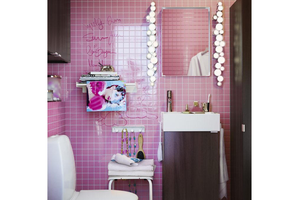 È perfetto per i bagni davvero minuscoli il mobile Lillången ad un'anta rivestita in lamina con lavabo in ceramica e specchio Enudden [Ikea, cm 40x41x92h €115 la composizione completa].