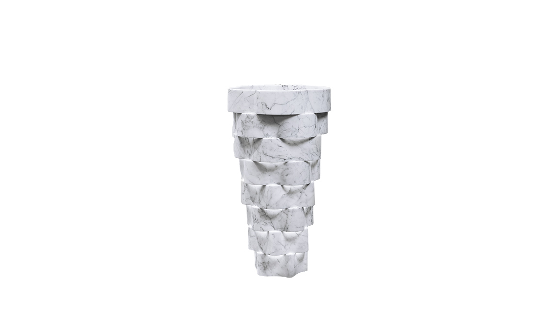In marmo di carrara, Intreccio è formato da sagome a fiore concentriche [Antonio Lupi, ø cm 47,5x85h prezzo dal rivenditore].