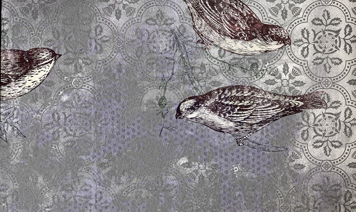 Originale e romantica, la carta The Birds ricorda un decoro parietale dai contorni sfumati. In fibra di vetro, con finitura Fibre Glass liscia o Fibre Tex a effetto trama [InstabileLab, da €109,80/mq].