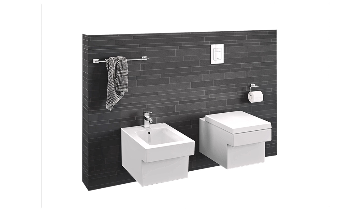 La collezione Cube è caratterizzata da PureGuard, un’innovativa tecnologia che conserva le superfici bianche e igienizzate grazie a ioni d’argento. Il vaso, rimless, ha lo speciale sciacquo Triple Vortex [Grohe].