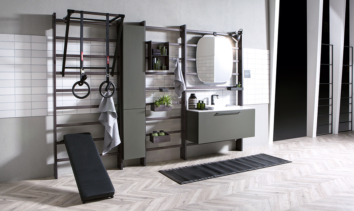 Il nuovissimo sistema GymSpace in multistrato Antracite è la base a cui si fissano gli elementi arredobagno e le attrezzature sportive. Qui ha due elementi Aquo in Laccato Opaco Verde Minerale, lavabo semincasso Elm e top in Mineralmarmo®, mensole e pensile a giorno, con frontale e schienale in multistrato, specchio, ganci per le salviette e lampada con attacco a pinza in metallo [Scavolini].