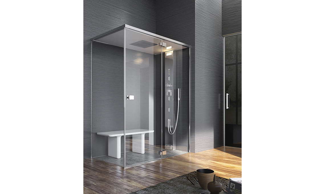 Noor Steam è il box in cristallo con colonna attrezzata in acciaio inox con miscelatore termostatico e deviatore con doccetta, 3 getti verticali orientabili, bagno di vapore con comando on/off a potenza variabile, aroma-dispenser, luce o cromoterapia. Ordinabile su misura da cm 100/160x70/100 [Glass 1989].