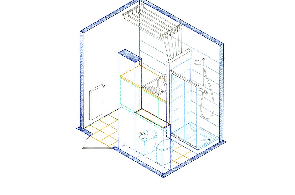 _Di fronte alla doccia basta costruire un muretto alto cm 120 circa per allinearsi alla sporgenza del pilastro e poter installare i 2 sanitari.